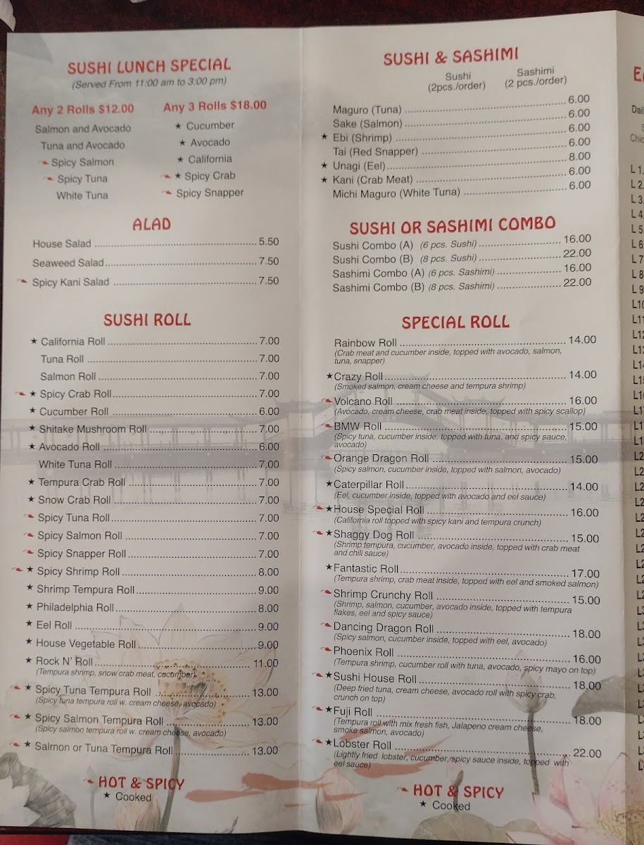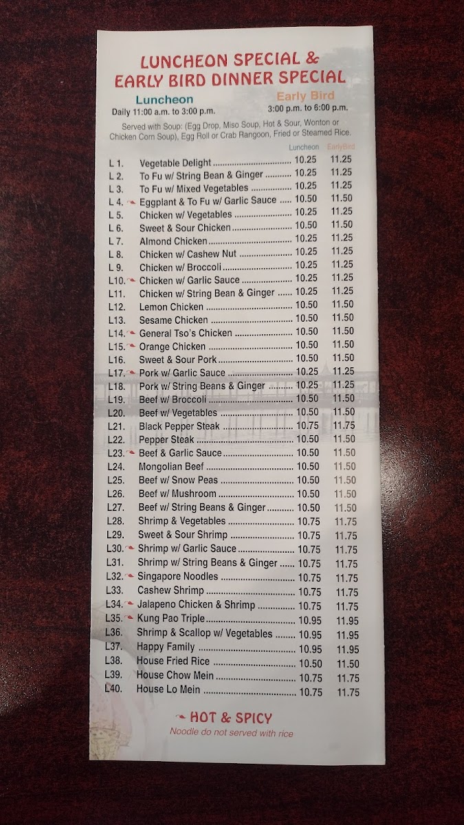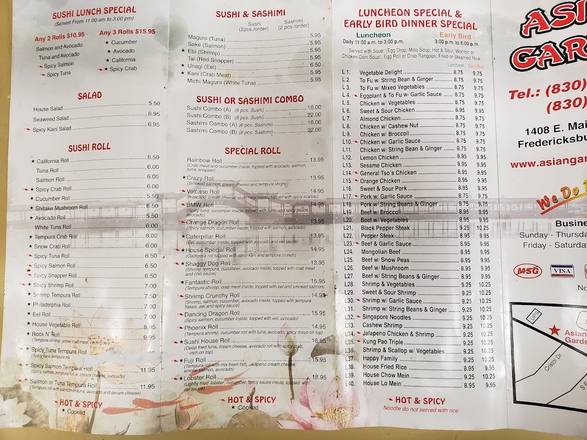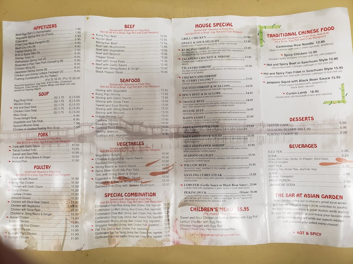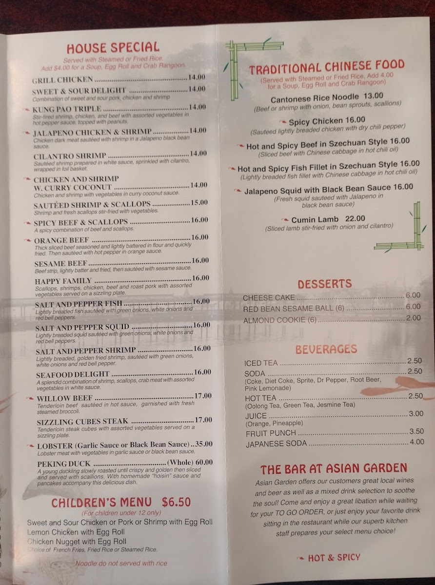 The menu at Asian Garden offers a diverse selection of traditional Chinese and Japanese dishes. It is organized into several key sections to accommodate a variety of tastes and dining preferences.
